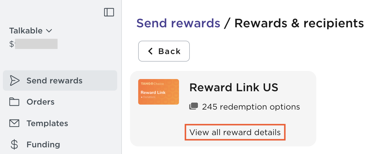 In the “Send rewards” portal section, select and click the Reward Link you intend to use to reward advocates in Talkable.